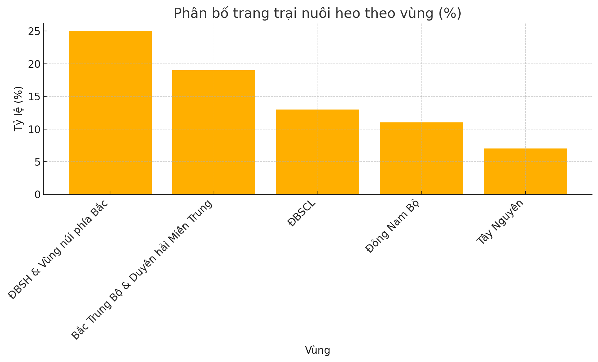 Các trang trại nuôi heo chủ yếu phân bố ở đồng bằng sông Hồng, Tây Nguyên, vùng núi phía Bắc (25%); Bắc Trung Bộ và Duyên hải miền Trung (19%); Đồng bằng sông Cửu Long (13%); Đông Nam Bộ và Tây Nguyên (11% và 7%)